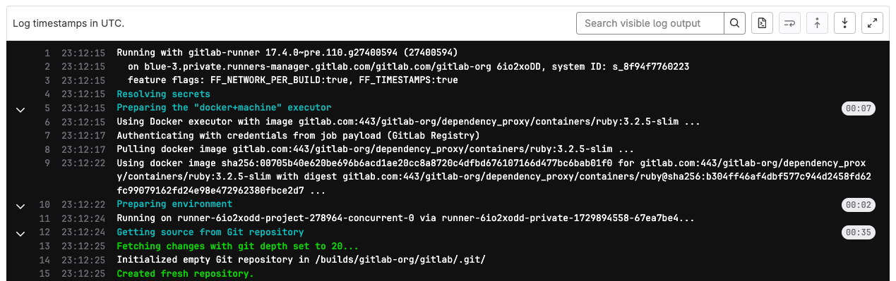 - echo "This job's log behavior depends on FF_TIMESTAMPS value"For more information, see define a CI/CD variable in the .gitlab-ci.yml file.
