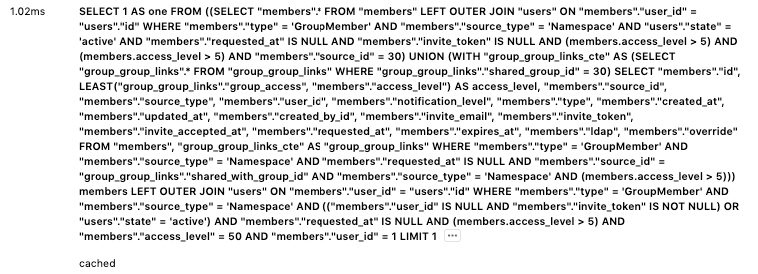 current_user_is_group_owner: current_user_is_group_owner }After fixing the cached query, the performance bar now shows only 6 cached queries: