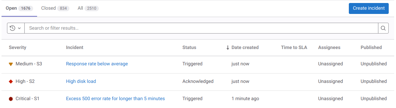 State: To filter incidents by their state, select Open, Closed, or All above the incident list.