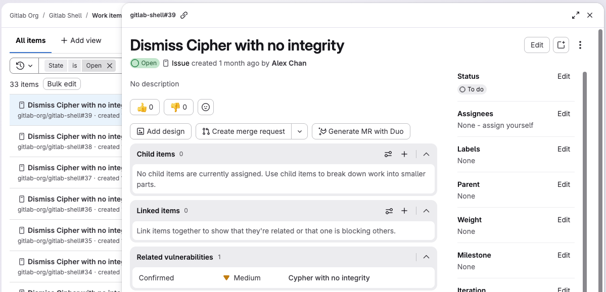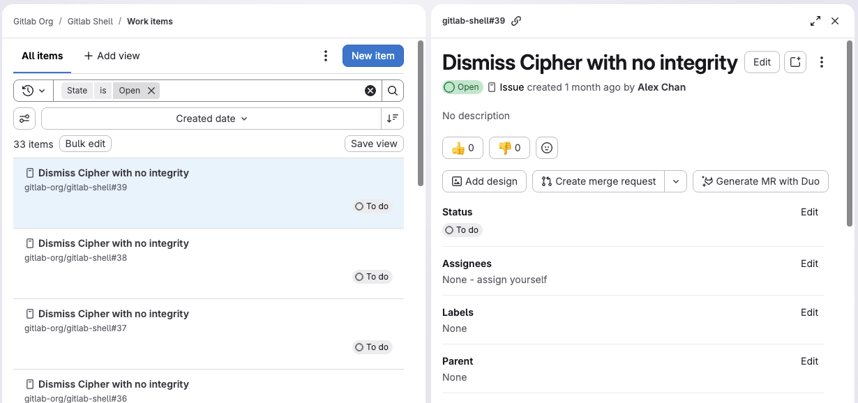 On the right, the GitLab Duo sidebar has buttons to access GitLab Duo Chat and related sessions.