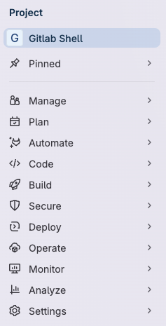 The left sidebar changes based on the information you’re viewing. For example, you might be viewing a project, exploring projects or groups, or viewing your profile. To switch to other areas of the left sidebar, use Search or go to in the top bar.