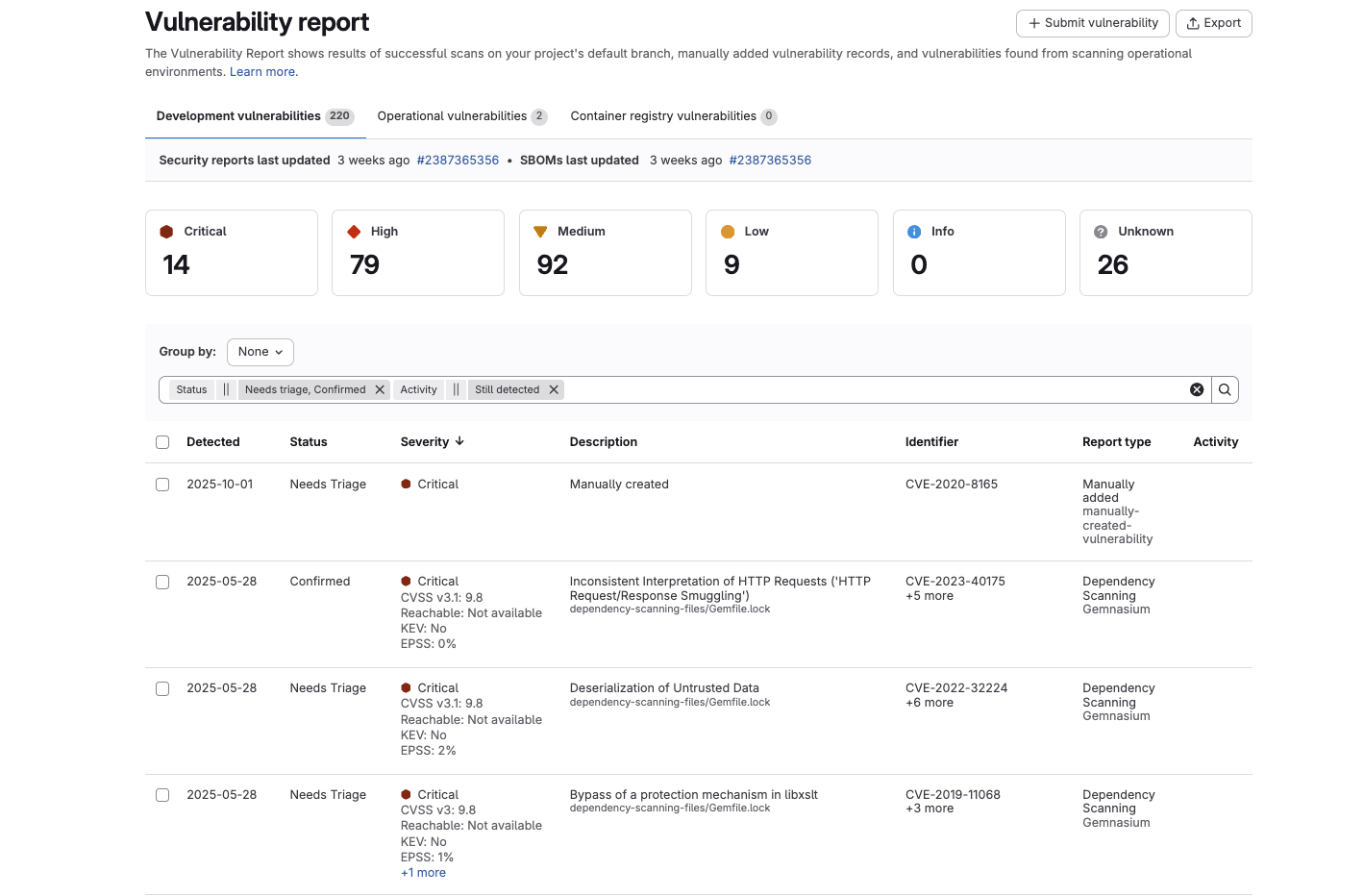 - Report type: The type of report that detected the vulnerability, such as SAST or Container fuzzing.
